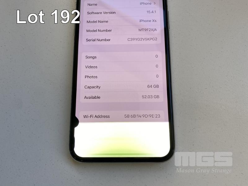 APPLE iPHONE XS, 64GB, SILVER, MODEL MT9F2X/A (NO CABLE, NO CHARGER) (NOTE: SCREEN FAULT - FLICKERS) S/N:C39YG2V5KPG2