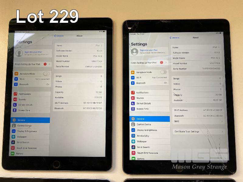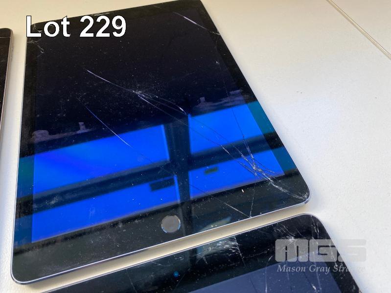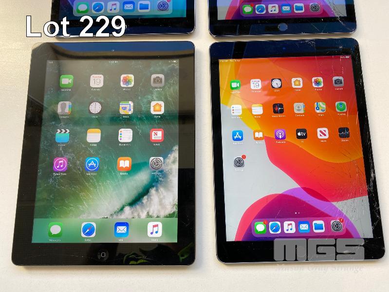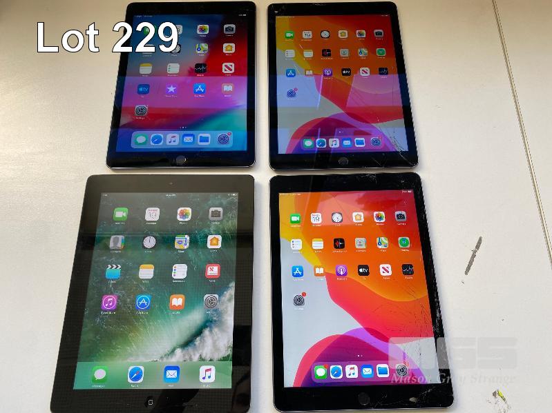 3 x APPLE iPAD AIR 2, 32GB, Wi-Fi, SPACE GREY, MODEL A1566 1 x APPLE iPAD 4TH GEN, 16GB, Wi-Fi, SPACE GREY, MODEL A1458 (NO CABLES, NO CHARGERS) (NOTE: ALL VARIOUS DAMAGE)