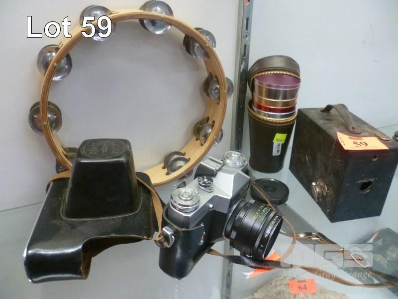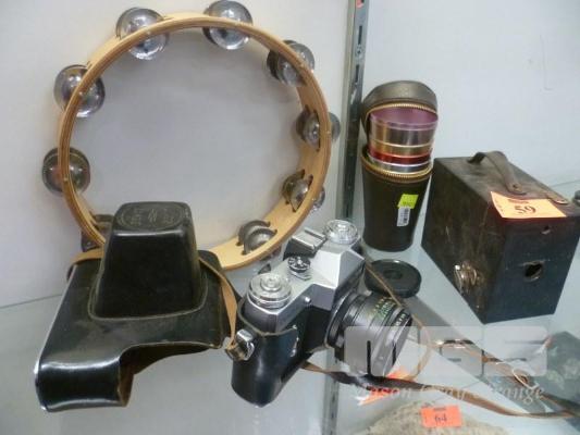 ZENIT-E 35mm CAMERA, VINTAGE KODAK BOX CAMERA, TAMBORINE & SET IODIZED CUPS