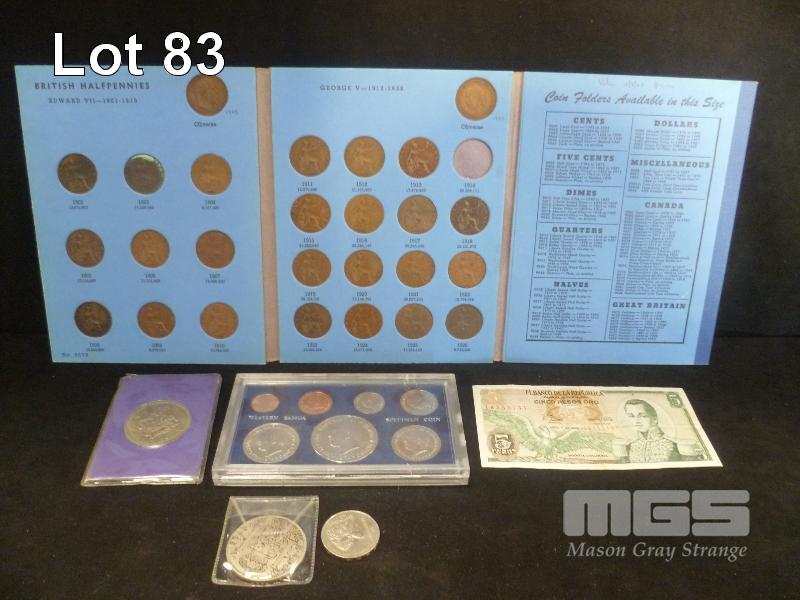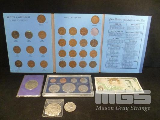 WORLD COINS & BANKNOTE, INC; GREAT BRITAIN HALFPENNIES COLLECTION 1902-1936 (NO 1914), 1974 WESTERN SAMOA PROOF COIN SET, 1966 JAMAICA 5 SHILLINGS, MEXICO, 1985, 75th ANNIVERSARY $200 COIN, 1801 HISPAN COIN, BOGOTA COLOMBIA 5 PESO BANKNOTE