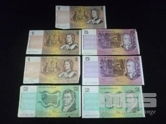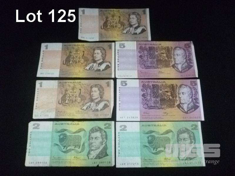 7 X AUSTRALIA, PAPER BANKNOTES, INC; 3 X $1, JOHNSTON/STONE, DHC 217656, DKS 278182, KNIGHT/WHEELER, CLE 977058 2 X $2, JOHNSTON/FRASER, LHR 217213, LBF 099158 2 X $5, JOHNSTON/FRASER, PZJ 578131, FRASER/HIGGINS, QET 243829