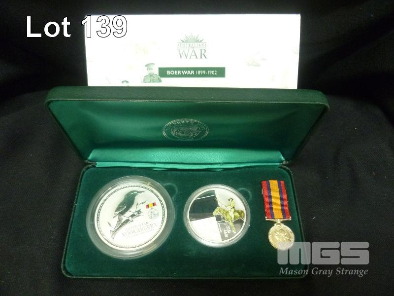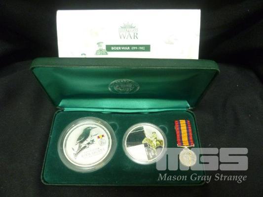 THE PERTH MINT, COIN & MEDALLION TRIBUTE SERIES, SILVER PROOF COLOURED COINS & MEDALLION, AUSTRALIANS AT WAR, BOER WAR 1899-1902, BOER WAR PRIVY MARK COIN 2oz PURE SILVER, BOER WAR MEDALLION 1oz SILVER, QUEENS SOUTH AFRIKA MEDAL, 651/1000