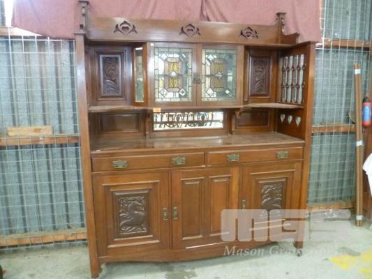 POLISHED TIMBER CHIFFONIER, MIRROR BACK, LEADLIGHT DOORS, 3 DOOR, 2 DRAWER UNDERSTORAGE, METAL CASTORS