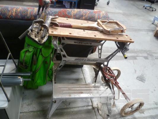 BLACK & DECKER WORKMATE, RETRO GOLF CLUBS IN GREEN BAG & DUNLOP TENNIS RACKET