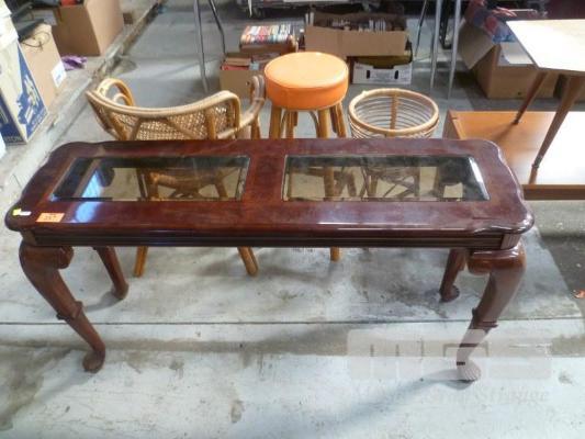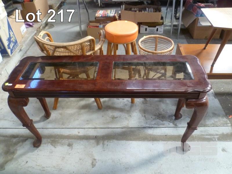 POLISHED TIMBER NARROW HALL TABLE, GLASS INSERTS