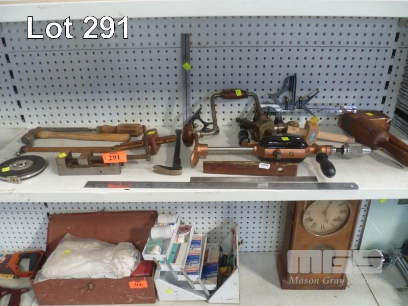 CARPENTRY HAND TOOLS, INC SCRIBES, SPIRIT LEVEL, VICE, SEET SQUARE & RULERS, BRACE DRILL, ETC
