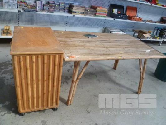 CANE RECTANGULAR DINING TABLE, GLASS TOP, 1255 x 94cm & CANE FRONTED CABINET, 2 DOOR