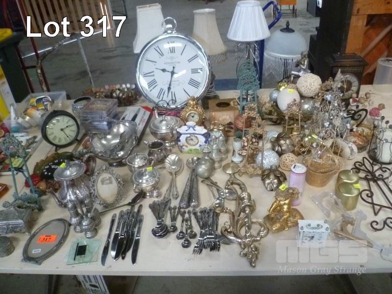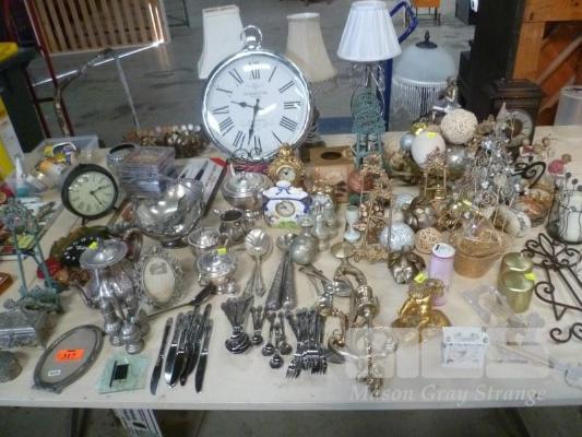 ASSORTED EPNS TABLEWARE, CLOCK,S DISPLAY STANDS, TABLE LAMPS, CD'S, ETC 1 x TABLE