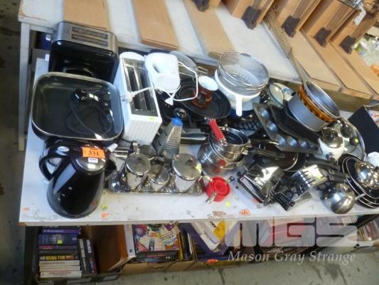 ASSORTED COOKWARE, KITCHEN APPLIANCES, ETC, 1 x TABLE