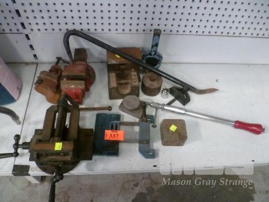 ASSORTED VICES, WEIGHTS, CROW BAR, ETC