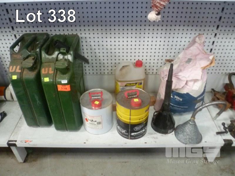 2 x STEEL 20 LITRE JERRY CANS, MIXING CANS, MINERAL TURPENTINE, FUNNELS, ETC