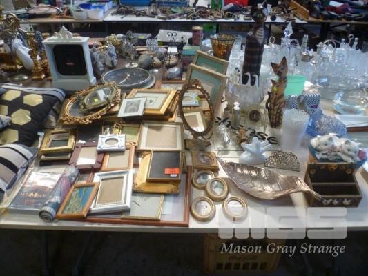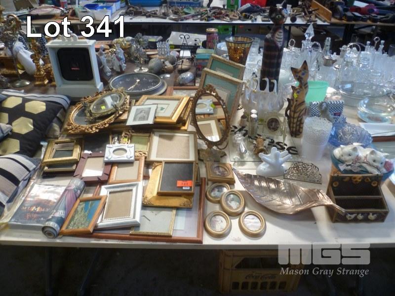 ASSORTED FRAMED PRINTS, EMPTY PICTURE FRAMES, BOWLS, MIRRORS, ETC, 1 x TABLE