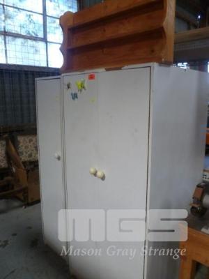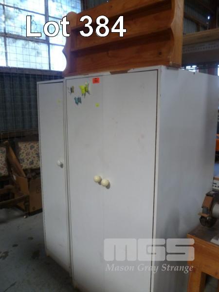 2 x WHITE LAMINATE CUPBOARDS & SHELF UNIT