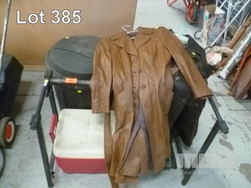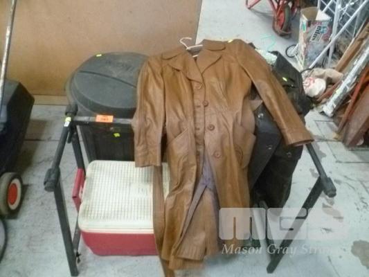 KEYBOARD STAND WITH PEDAL, 2 x LADIES LONG LEATHER JACKETS, IGLOO COOLER & 3 x PLASTIC BINS WITH LIDS