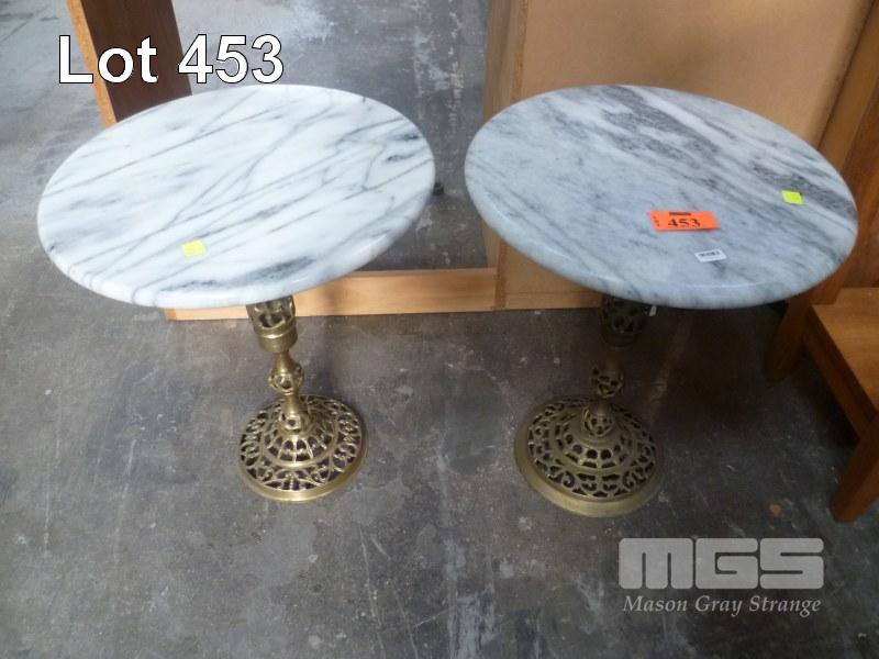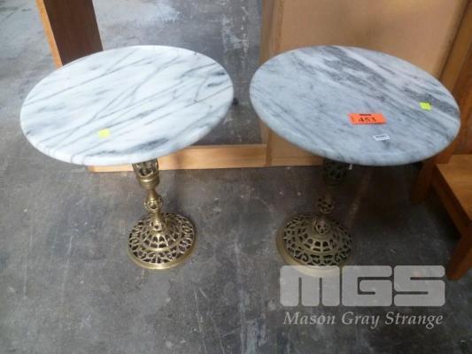 2 x SMOKERS TABLES. CIRCULAR WHITE MARBLE TOP WITH ORNATE BRASS PEDESTAL & BASE.
