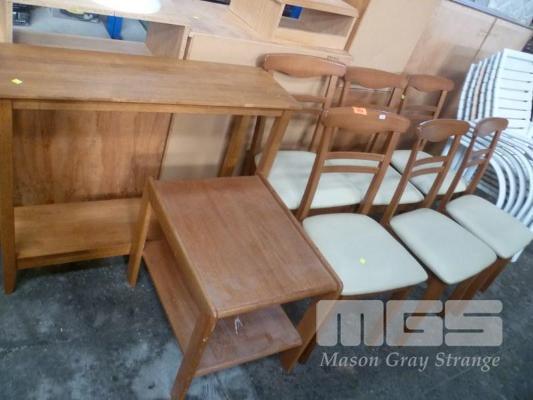 6 x RETRO PADDED PVC SEAT WOODEN DINING CHAIRS AND 2 x SIDE TABLES.
