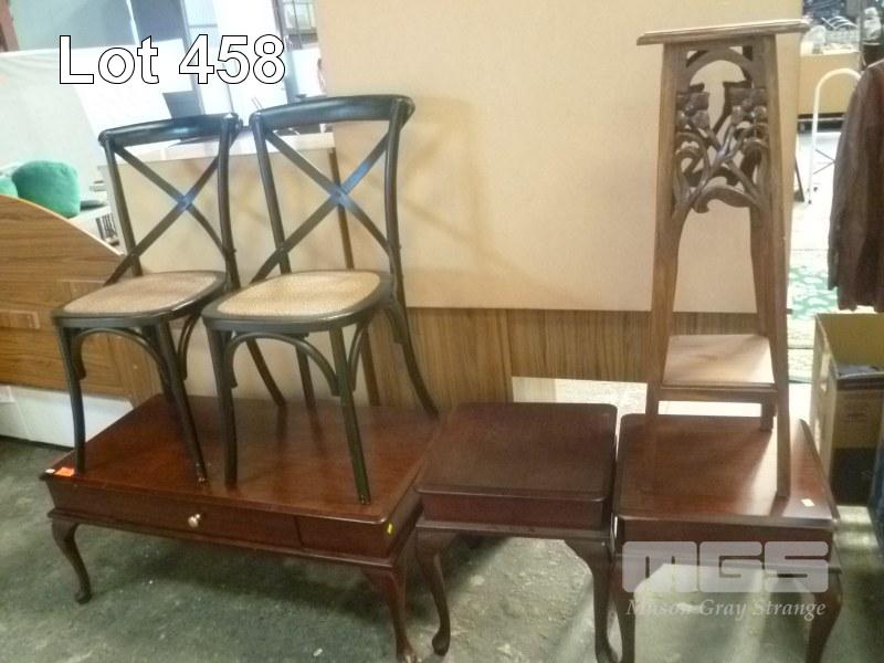 2 x RATTAN SEAT CROSS-BACK DINING CHAIRS, CABRIO LEG SINGLE DRAWER COFFEE TABLE, 2 x CABRIOLE LEG SIDE TABLES AND CARVED WOOD POT STAND/PEDESTAL.