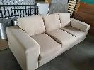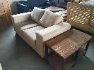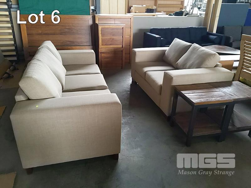 BOX ARM FABRIC LOUNGE SUITE COMPRISING 3-SEAT AND 2-SEAT LOUNGES AND 2 x RUSTIC SOLID TIMBER STEEL FRAME SIDE TABLES