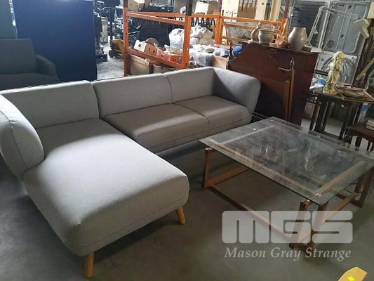 3-SEAT CHAISE FABRIC SECTIONAL SOFA IN LIGHT GREY AND GLASS TOP COFFEE TABLE ON TEAK GEOMETRIC BASE 105 x 105 CM.