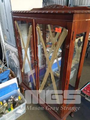 VINTAGE GLAZED 2-DOOR DISPLAY CABINET WITH PIE CRUST TRIM. 32 x 93 x 145(H) CM.