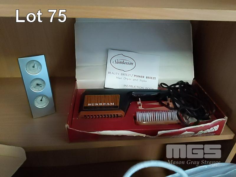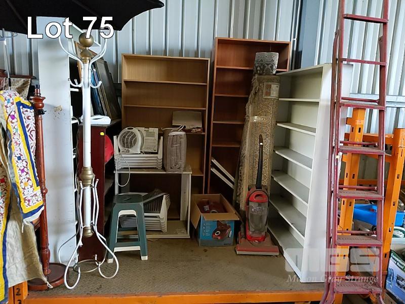 BAY LOT OF HOUSEHOLD FURNITURE AND OTHER GOODS INCLUDING BOOKSHELVES, NILFISK "HEPA" VACUUM CLEANER, HOOVER " WIDEPATH" UPRIGHT VACUUM, CLEANER, 2 x FLOOR RUGS, VINTAGE SUNBEAM HAIR DRYER WITH ORIGINAL PACKAGING, HAT STAND, FLOOR LAMP POST, EVER REST "MINK BLANKET" IN ORIGINAL PACKAGING, "L. T. KENNETT" STEEL LADDER IN RED AND MORE (1 x STILLAGE).