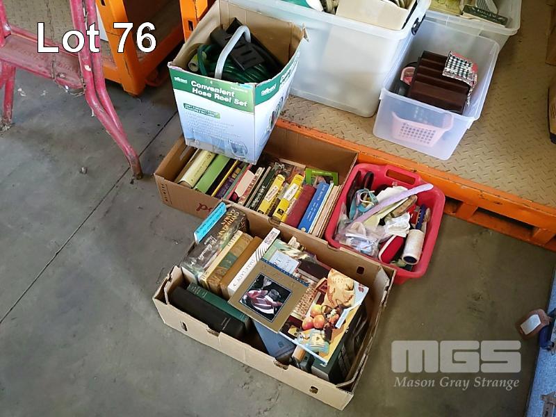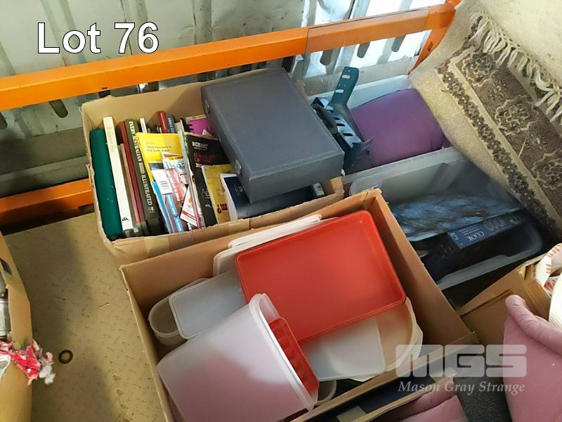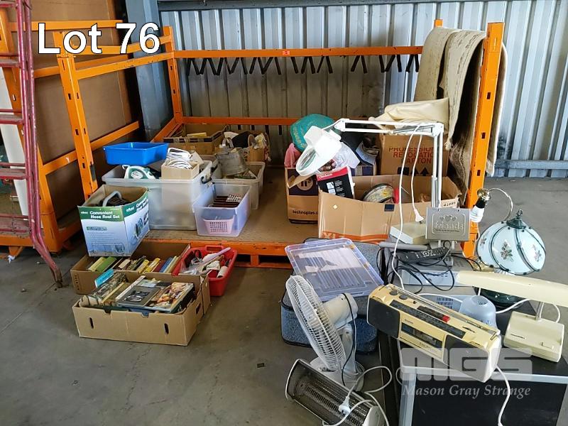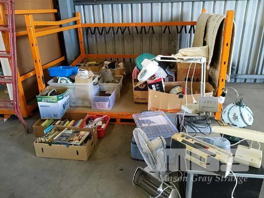 BAY LOT OFF HOUSEHOLD GOODS AND COLLECTABLES INCLUDING APPLIANCES, WRITING PAPER AND STATIONERY, LP RECORDS AND CDS, BOOKS, CRAFTING SUPPLIES, LINEN, FLOOR RUGS, THROW CUSHIONS, COLLECTABLE TINS, VINTAGE SUITCASES, LAMPS, GARDEN HOSE REEL, QUANTITY OF GARDEN CHEMICALS AND MUCH MORE (1 x STILLAGE AND FLOOR IN FRONT OF STILLAGE).