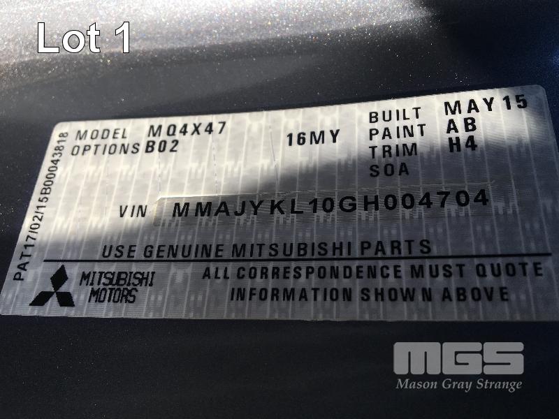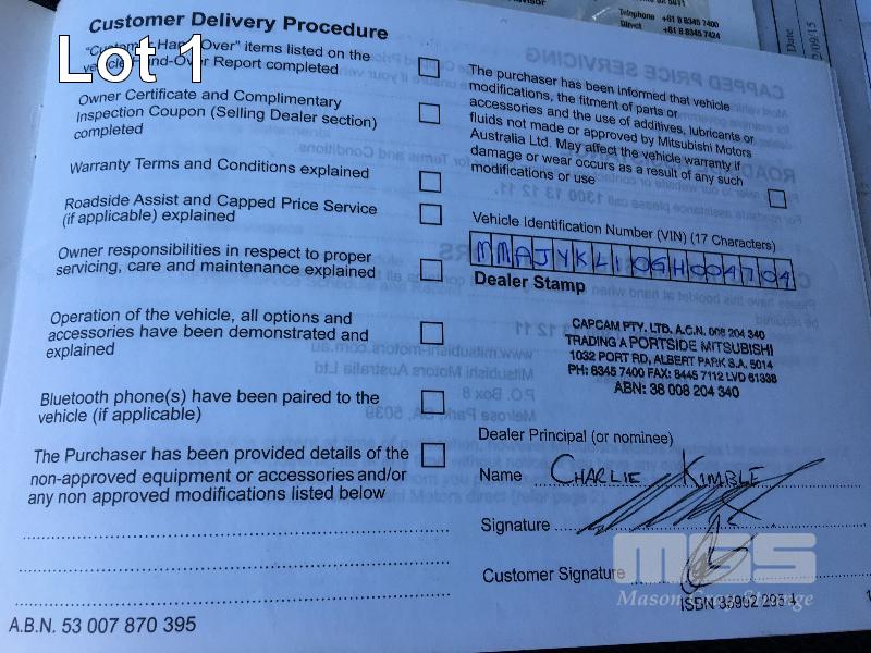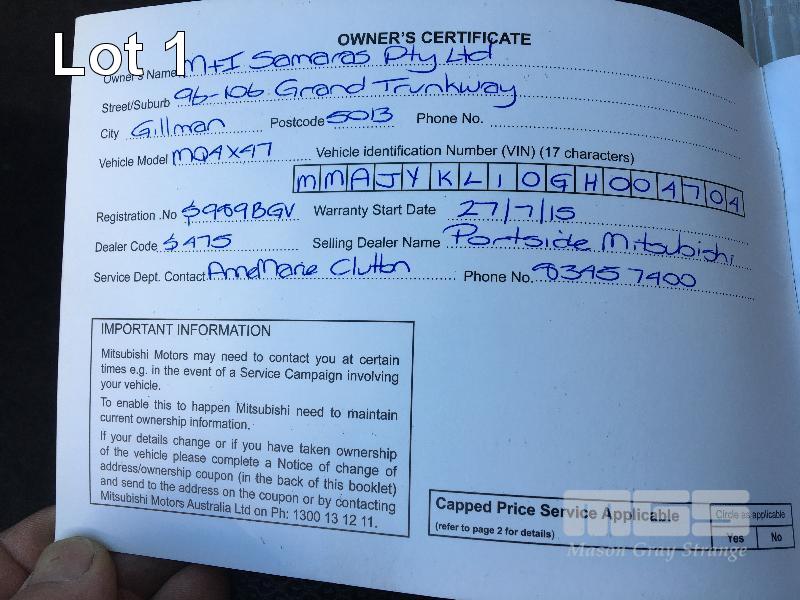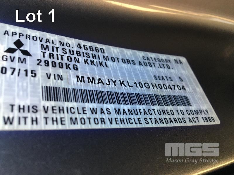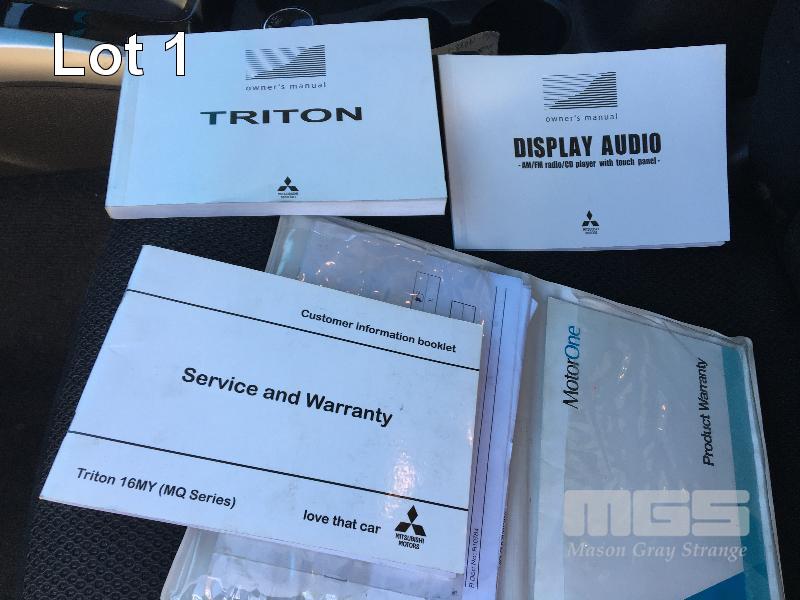 2015 MITSUBISHI TRITON MQ4X47 DUAL CAB UTILITY 4x4 REG: S989 BGV (SA) VIN: MMAJYKL10GH004704 ENG: 4N15UAB8430 ODO: 258,283kms SHOWING 4N15, 4 CYLINDER TURBO DIESEL, AUTOMATIC TRANSMISSION, GREY DUCO, 4 DOORS, 5 SEAT, 4x4 ABS, AIR BAG, AIR CON, ALLOY WHEELS, BLUETOOTH, BULL BAR, CD PLAYER, CENTRAL LOCKING, CRUISE CONTROL, FOG LAMPS, IMMOBILISER, POWER STEERING, POWER WINDOWS, SIDE STEP, SPARE WHEEL, SPOT LIGHTS, TOW BAR, ALLOY ROLL BAR FIBREGLASS HARD TOP UTE COVER KEY #6 (WITH PAPERS, WITH 1 KEY/S, WITH OWNER'S MANUAL, WITH SERVICE BOOKS)