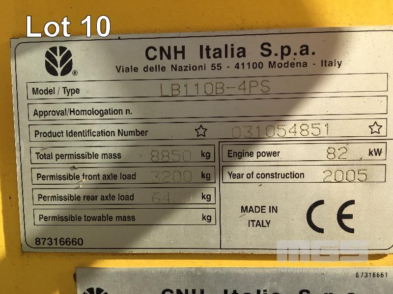 2005 NEW HOLLAND LB110B-4PS 4x4 BACKHOE FRONT END LOADER REG: DVP 897 ENG: 00214698 HOURS: 9,250hours SHOWING 4 CYLINDER DIESEL, 82kw, PIN: 031054851 FULLY ENCLOSED A/C CAB 2 WAY RADIOS 4 IN 1 BUCKET 5 x TRENCHING BUCKETS, 300, 400, 450, 550 & 750mm 1200mm GP BUCKET RIPPER ATTACHMENT & SPARE RIM FULL SERVICE HISTORY KEY #11 (WITH PAPERS, WITH SERVICE BOOKS)
