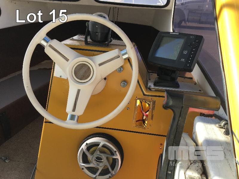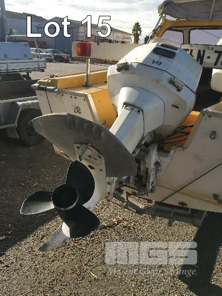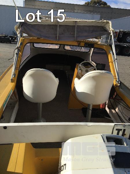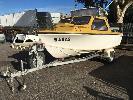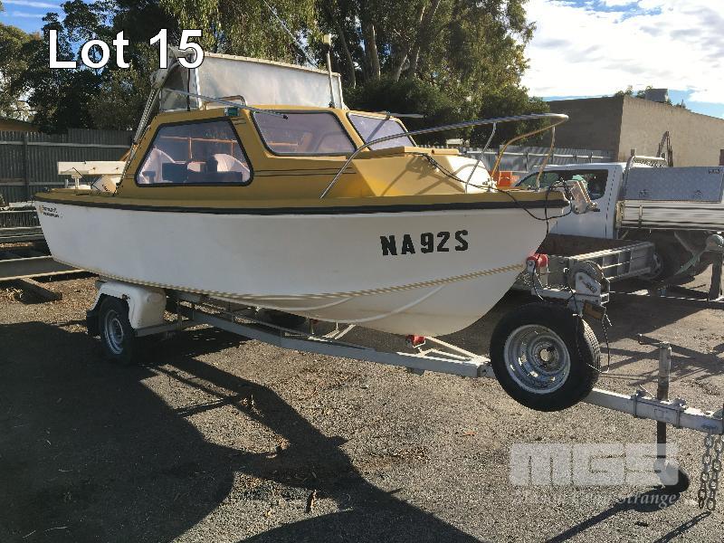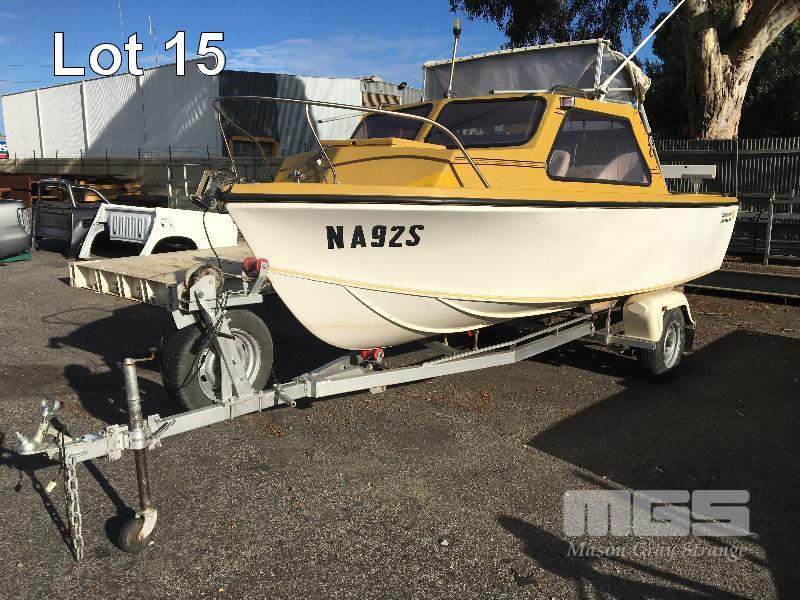 SPORTSCRAFT HUSTLER HALF CABIN BOAT 5m, FIBREGLASS HULL MARINE REG: NA92S HIN: AUTSA021901BZ5 FITTED WITH JOHNSON 90HP, V4 PETROL OUTBOARD ENGINE WHITE/YELLOW, CANOPY, ECHO SOUNDER, ON 1976 SINGLE AXLE TRAILER, TINKA REG: TLN 786 (SA) CHASSIS: 5170111 GVM: 750kg BALL HITCH, WINCH & SPARE WHEEL, WITH PAPERS