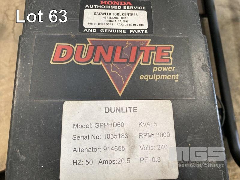 GENSET, DUNLITE MOD: GPPHD60 HONDA 2 STAGED-01 5KVA, 9HP DIESEL ENGINE 240V
