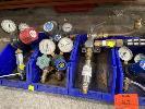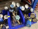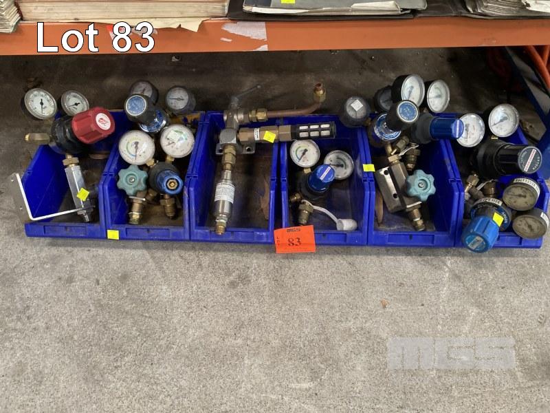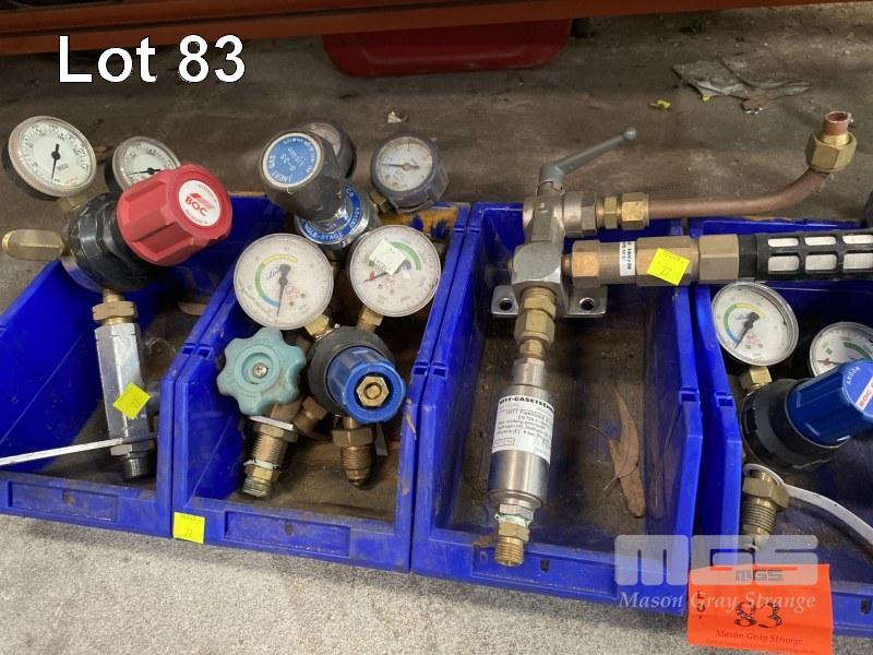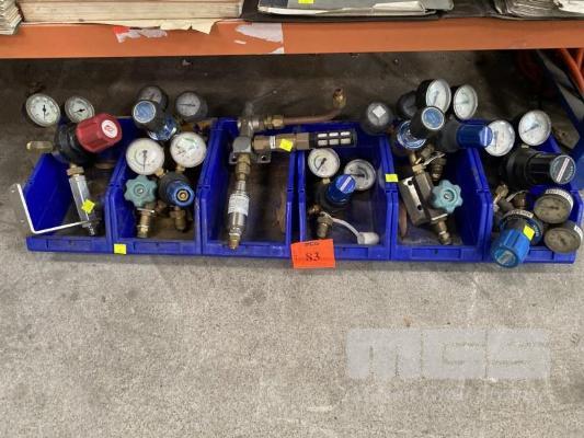 8 x ASSORTED BOC GAS REGULATORS, INC ARGON, OXYGEN, INERT GAS INC BRASS VALVES, FLASH BACK ARRESTORS, ETC IN PLASTIC TUBS