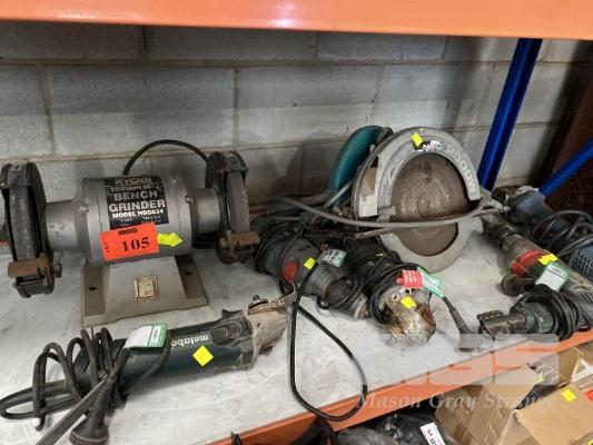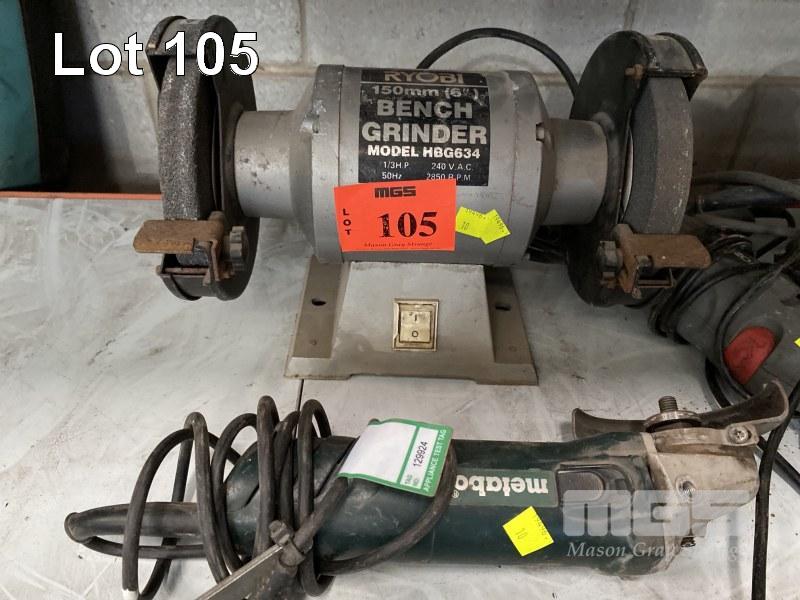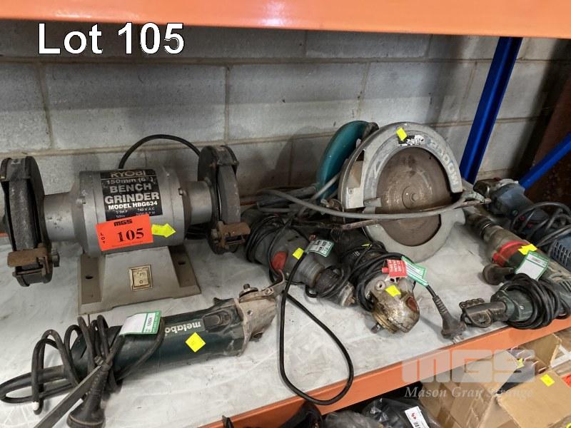 ASSORTED POWER TOOLS INC METABO ANGLE GRINDER & HAMMER DRILL, OZITO ANGLE GRINDER & HAMMER DRILL, BOSCH ANGLE GRINDER, MAKITA CIRCULAR SAW, 220mm & RYOBI BENCH GRINDER MOD: HBG634 150mm, 240V