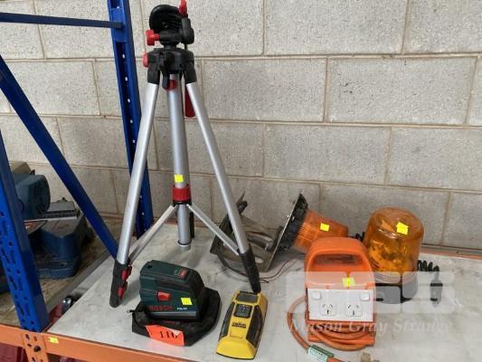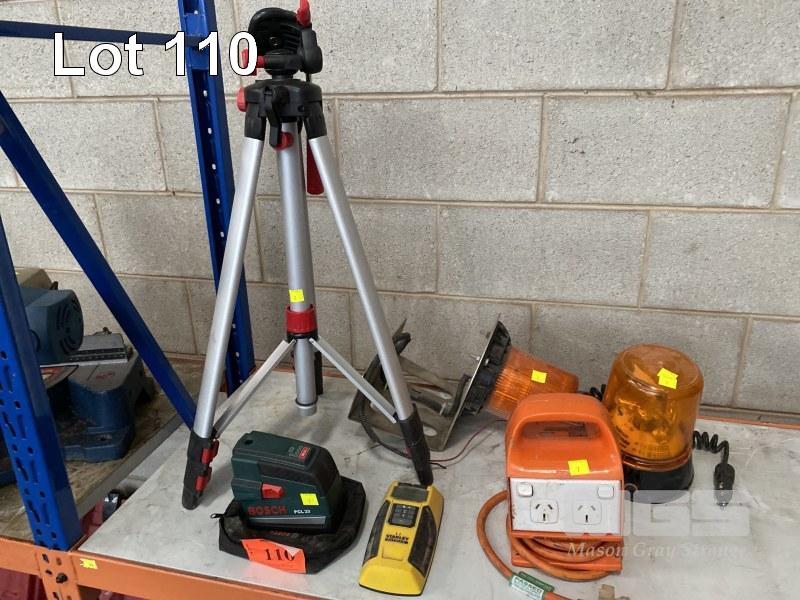 LASER LEVEL, BOSCH MOD: PCL20 WITH ALLOY TRIPOD, STANLEY FATMAX STUD DETECTOR 2 x ROTARY HAZARD LIGHTS, 12V & HPM RCD POWER BOX