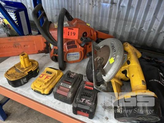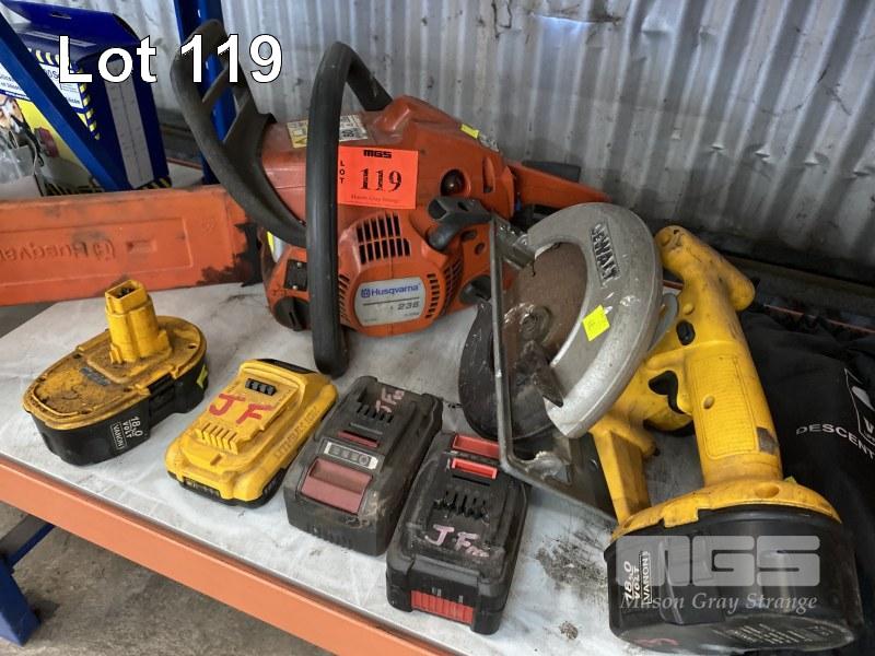 CHAINSAW, HUSQVARNA MOD: 236 X-TORQ PETROL & DEWALT CORDLESS CIRCULAR SAW MOD: DW939 WITH BATTERY, NO CHARGER & 4 x ASSORTED BATTERIES