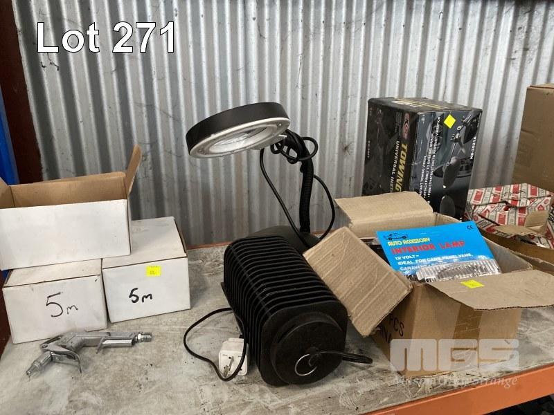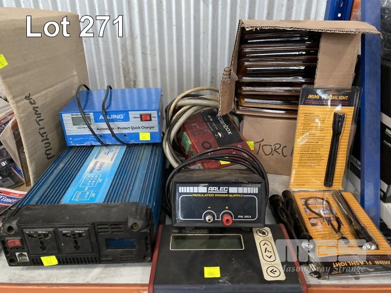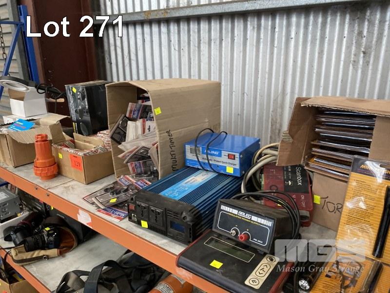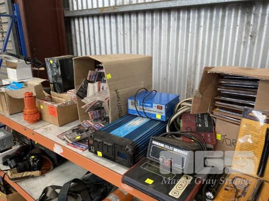 POWER INVERTER, PURE SINE 1500w, HARDI SCANBOX, 2 x BATTERY CHARGERS, 2 x BOXES (12/BOX) MINI TORCHES 3 x 415V PLUGS, LAMPS, ETC 1 x SHELF
