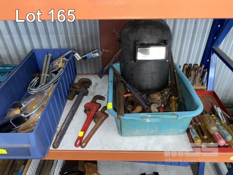 ASSORTED HAND TOOLS INC SHIFTERS, PIPE WRENCHES, PLIERS, CLAMPS, SCREWDRIVERS, PUNCHES, SOCKETS, SOLDERING IRONS, DRILL BIT & DRIVER SET, SPRING DRAIN CLEANERS, ETC 1 x SHELF