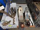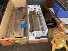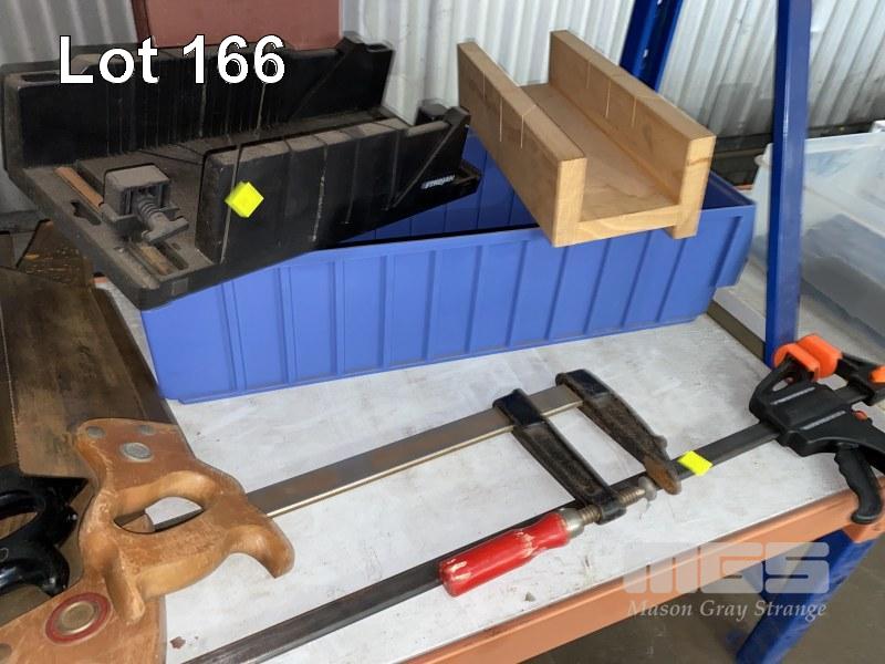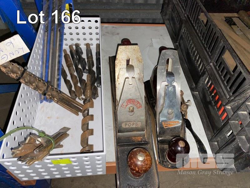 2 x HAND PLANES, POPE FALCON & TURNER, WOODWORKING DRILL BITS, FILES, HAND SAWS, SLIDING CLAMPS & MITRE BOXES 1 x SHELF