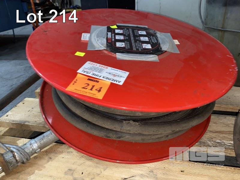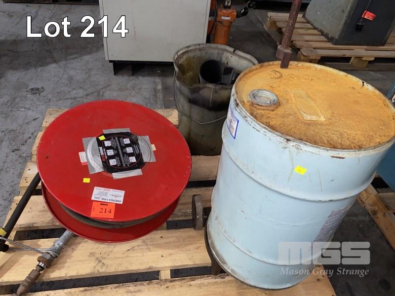 FIRE HOSE REEL, ONE STEEL WITH HOSE & NOZZLE, FUNNELS, BUCKET, DRUM TROLLEY & PART DRUM GUN WASH 1 x PALLET