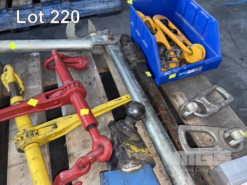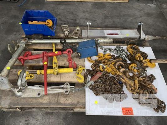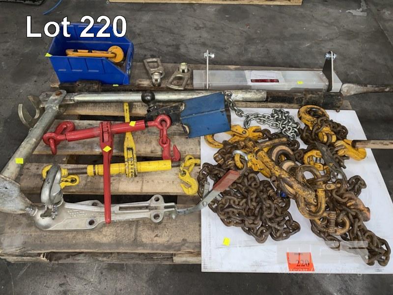 4 LEG LIFTING CHAIN, NOBLES 10mm CHAINS WITH HOOKS & SHORTENERS 4 TONNE, 2 x CHAIN DOGS, RATCHET TYPE 4 x SWIFT LIFTING ATTACHMENTS, 1.3 & 2.5T STAR DROPPER EXTRACTION TOOL, BALL & HITCH, ETC 1 x PALLET
