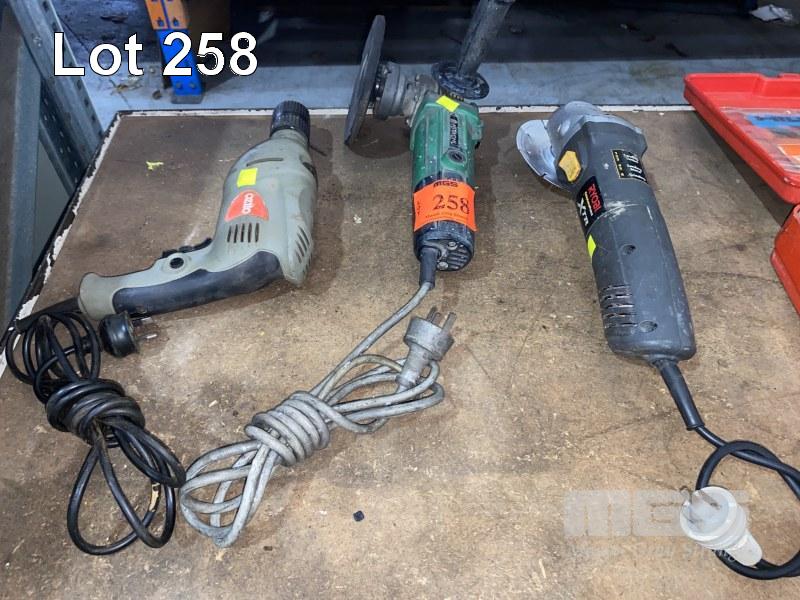 ANGLE GRINDER, RYOBI, HITACHI DISC SANDER & OZITO DRILL,240V