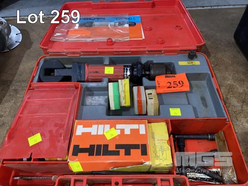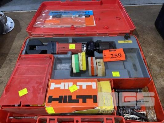 HILTI EXPLOSIVE FIXING TOOL, MOD: DX100L WITH ASSORTED CARTRIDGES & FASTENERS, IN PLASTIC CARRY CASE