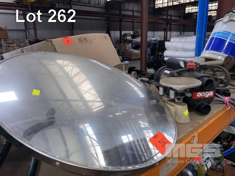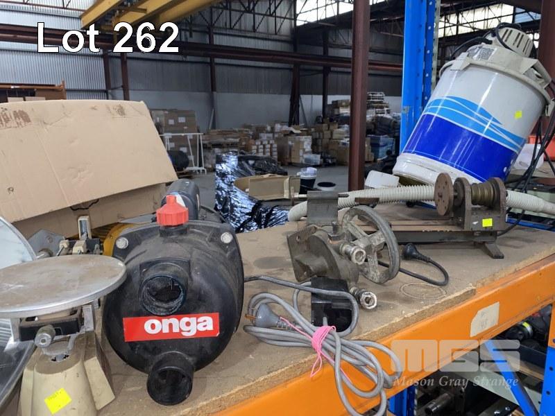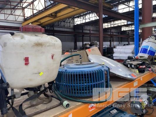 SPRAY PACK, RETRACTA HOSE REEL, DOME MIRROR, PUMP,SCALES, WOOD TURNING LATHE & VAC 1 x SHELF
