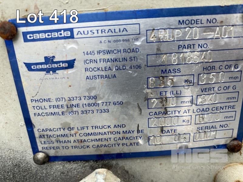 ROTATING GRAB ATTACHMENT, HYDRAULIC, CASCADE MOD: 4RDP20-A01 PART NO: 1818640 CAPACITY: 2,000kg DOM: 10/04 GRAB WIDTH: 840mm GRABN LENGTH: 1160mm SUIT FORKLIFT