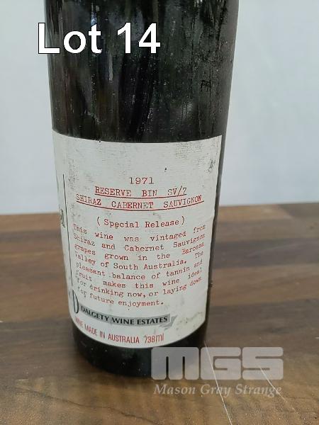 1971 STONYFELL (SPECIAL RELEASE) RESERVE BIN SV/7 BAROSSA SHIRAZ CABERNET SAUVIGNON. SINGLE 738ML CLARET BOTTLE, UNDER CORK. FILL LEVEL " BASE OF NECK". CAPSULE SOUND. BOTTLE & LABEL FAIR TO GOOD.