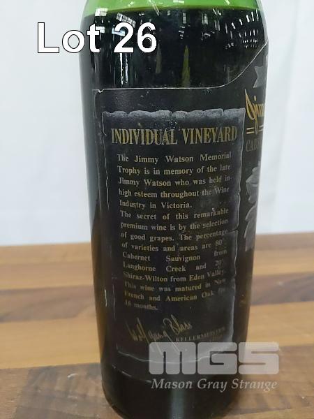 1973 WOLF BLASS BLACK LABEL CLARET - LANGHORNE CREEK ~ EDEN VALLEY CABERNET SAUVIGNON SHIRAZ. SINGLE 750ML CLARET BOTTLE, UNDER CORK. ** JIMMY WATSON TROPHY WINNER MELBOURNE WINE SHOW 1974 ** FILL LEVEL "LOW SHOULDER". CAPSULE FAIR, SOME CRUST ON TOP. BOTTLE & LABEL FAIR TO GOOD.