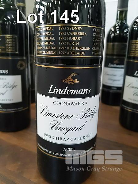 1990 LINDEMANS "LIMESTONE RIDGE VINEYARD" SHIRAZ CABERNET. CASE OF 12 X 750ML CLARET BOTTLES , UNDER CORK. FILL LEVELS "BASE OF NECK" WITH ONE AT "MID SHOULDER" AND ONE AT "TOP SHOULDER". CAPSULES FAIR TO GOOD WHERE NO SEEPAGE. SEEPAGE ON THREE. BOX FAIR. BOTTLES & LABELS GOOD.