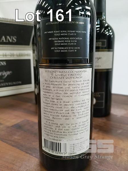 1995 LINDEMANS COONAWARRA "ST GEORGE" CABERNET SAUVIGNON. PACK OF 6 X 750ML CLARET BOTTLES , UNDER CORK. FILL LEVELS ALL "IN NECK". CAPSULES GOOD. BOX FAIR. BOTTLES & LABELS GOOD.