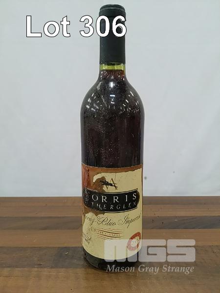 1988 MORRIS OF RUTHERGLEN SHIRAZ-BLUE IMPERIAL. SINGLE 750ML CLARET BOTTLE, UNDER CORK. FILL LEVEL "IN NECK". CAPSULE GOOD. BOTTLE FAIR. LABELS POOR, STAINED.