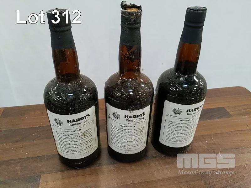 1965 HARDY'S VINTAGE PORT - BIN No. M778. 3 X 750ML PORT BOTTLE, UNDER CORK. CASULES AVERAGE, ONE WITH TORN TOP. BOTTLES & LABELS FAIR TO AVERAGE.