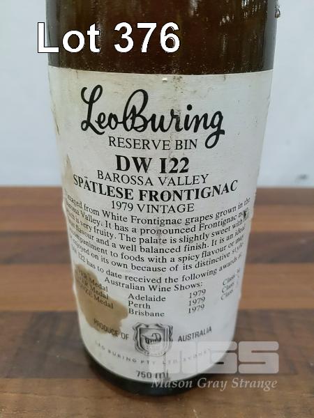 1979 LEO BURING RESERVE BIN BAROSSA VALLEY SPATLESE FRONTIGNAC - DW 122 SINGLE 750ML RIESLING BOTTLE, UNDER CORK. FILL LEVEL "5CM". CAPSULE FAIR. BOTTLE & LABELS FAIR TO AVERAGE, DRIP STAIN ON LABEL.